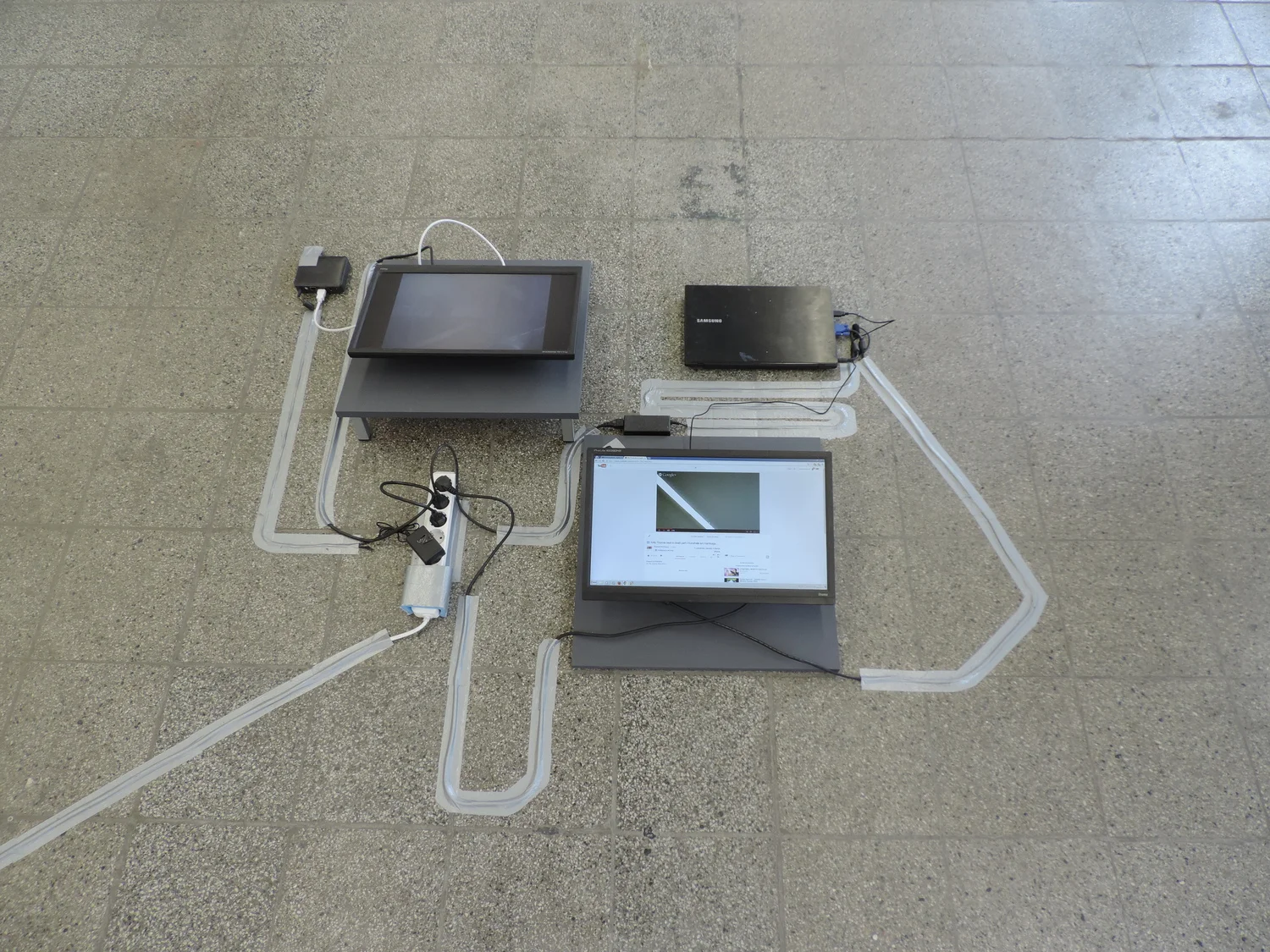 Positioned opposite Screen 1, a webcam records the observer, while Screen 2 displays a live video feed of the audience watching the first video. These recordings are accessible at: https://www.youtube.com/watch?v=QtJN06TcyHQ.